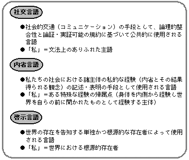 単独かつ根源的な存在者である「この私」の経験を語る言語(すなわち「この私の世界」を告知する啓示言語)は存在しない。なぜなら、「この私の世界」を語る言語は、「私たちの社会」における諸主体の私的な経験(内省とその結果得られる観念)を記述・表明する言語のうちに回収されるしかないから。