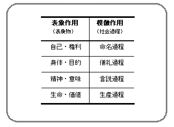 模倣作用は、四つの異なった社会過程を紡ぎ出す。それらは、表象作用によって諸主体の意識の網の目に捕捉された四つの表象物に対応している。第一に、自己という意識(あるいは「私」と発語する権利の行使)に対応するそれは命名過程である。第二に、性的身体のイメージ(あるいは盲目的な目的の達成)に対応するそれは儀礼過程である。