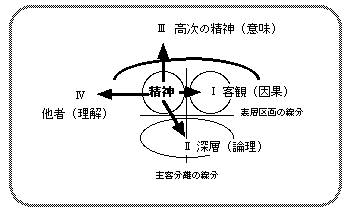 第二は、精神が事象にかかわっていくこと、客観を客観として確定することそれ自体を探究の対象とすることである。その端緒は、客観的事象が生起する場の根底に名状しがたい深みを見出すこと、さらには精神そのものが内蔵する深層(無意識)との構造的同型性や相互変換可能性といった論理関係を見出すことに求められるだろう。
