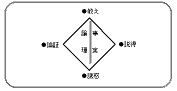 しかし、論証の言説によっては表現できない事柄がある。それは深層構造の存在の意味であり、ひいては諸事象が社会的に生成しあるいは産出されることのうちに孕まれている意味である。このことを言説そのもののかたちにおいて明示するのが(具体的には、臨機応変の比喩や言葉の響き、あるいは発語者の身体に根差した力の発動を通じて感得させるのが)、言説の第三の類型、すなわち教えの言説である。