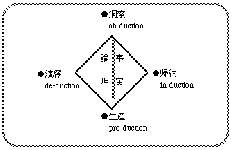 言説の四類型は、推論の四類型に対応している。第一に、説得の言説に対応するのは帰納 である。帰納において、A⇒Bという定式が諸事象間の因果関係を表現していることはいうまでもない。第二に、論証の言説に対応するのは「演繹」である。そこでは、A⇒Bという定式は論理的同型性あるいは同値関係を表現している。