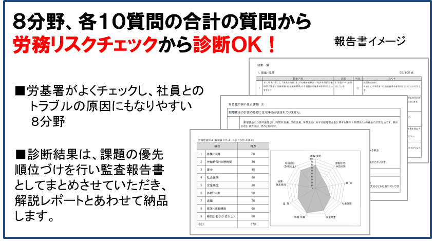 ◆次の8分野10項目(計80項目)の労務リスク診断を行います。
