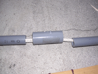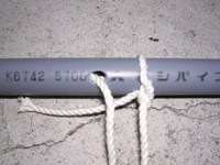 | 雨・風を避けるために巻き取り機能を仕込むのですが長さ250cmの重さは2kgあり市販のものでは対応できず自作することにしました。引きひもに太さ3mmのタコ糸50m、吊り下げ用の竿として塩ビパイプ90cm×3本・ソケット2個・エルボ1個・キャップ1個(水道管用)を用意、90cm×3本にしたのは、通す作業が簡単・収納時もコンパクト・増設も可能なためです。塩ビ管にそれぞれ二箇所穴を開けタコ糸を通し、パイプを継ぎ合わせて(接着していません)ステーに掛ければ完成です。 |
