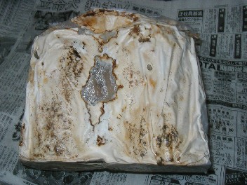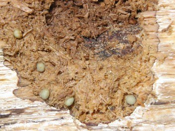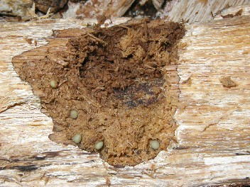 下に2個の卵が見えます。 左の黒くなっている卵は、ダニにやられました。 |