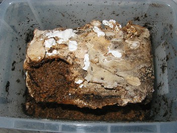 1本が入るケースを用意。 カワラ材を入れ、♀を投入。 これで、セット完了。 私は、マットに産卵木を埋めません。 |