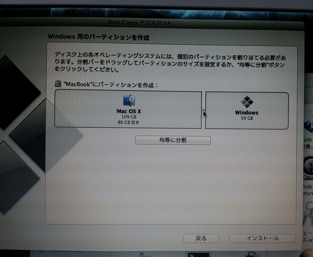 パーティションは数値入力ではなく、マウスのドラッグでズルズルと変化します。カッコイイ!! 特に理由は無いのですが、とりあえず50GBくらいにしておきます。 |