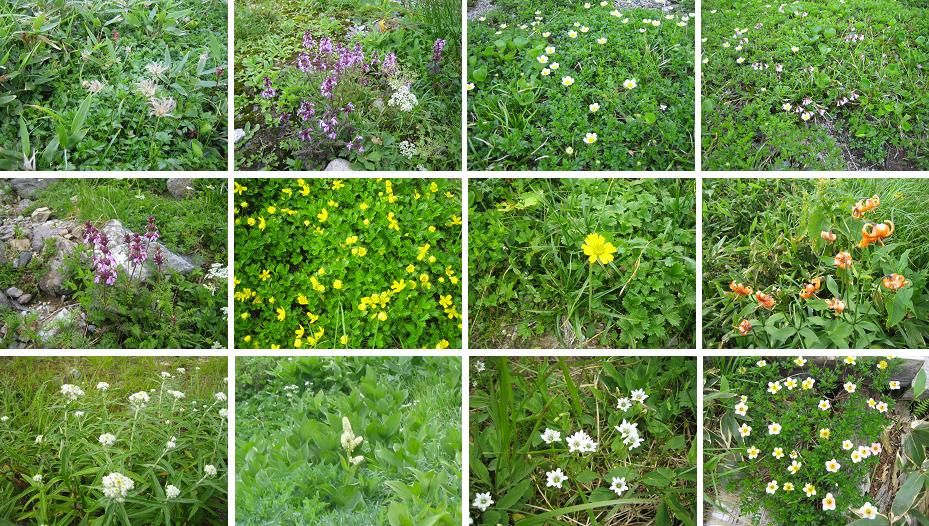 | [高山植物の写真]。 ここでは、室堂や弥陀ヶ原で見かけた高山植物をまとめて紹介。 花の名は、詳しい方にお任せするが、冬の間雪の下に埋もれているせいか、小さなかわいらしいものばかり。 特に、チングルマという花をたくさん見かけた。 |
