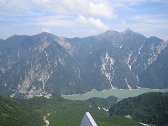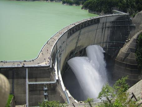 | トロリーバスを降りて、展望台まで約200段の階段を登ると(がんばって是非登ってください)、いきなり別世界が広がっていた。立山を背景にしたクロヨンの姿は、いつまで眺めていても飽きない絶景だった。 満々と蓄えられた水はやや緑色。森の緑が溶け出したような色だ。 |