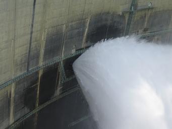 | 毎秒15トンの放水量と聞いたが、間近で見ると大迫力だ。 | |