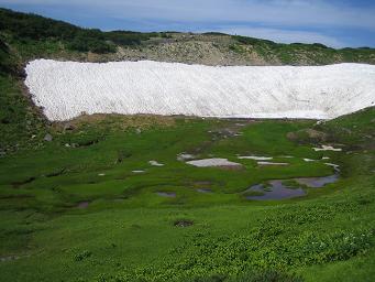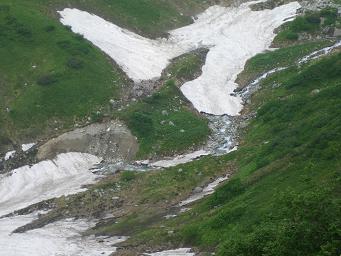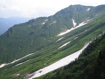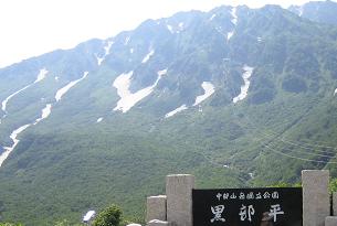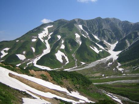 | このあたりまで来ると、残雪(万年雪)が残っている。草木の緑と残雪の白さとのコントラストが、立山の美しさの特徴だ。 | |
