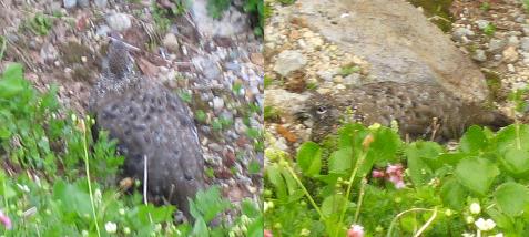 | 幸運にも、ミクリガ池の歩道近くで雷鳥に遭遇。近くのおばさんが教えてくれた。 シャッターの音に驚いて、すごいスピードで目の前を駆け抜けて行った。おまけに夏の保護色の土色なので、周りと見分けることが難しい。 |