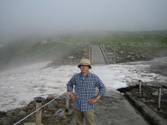 | トロリーバスでトンネルを抜けると、そこは室堂だ。残雪はそこらここらにあり、人の通る道にも積もっている。 山の午後は雲がかかることが多い。この日も霧が(下界から見れば雲が)次々とかかっては去り、日が差したと思うと、すぐに周りが見えなくなる。 とりあえず初日ということで、ミクリガ池周辺を散策。長袖を着ていてちょうどいい涼しさだ。 |