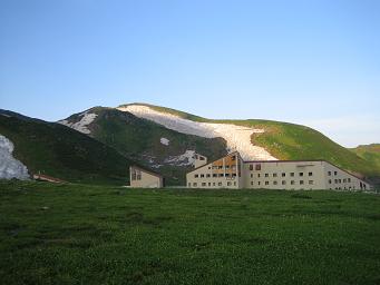 | 宿泊先の、「ホテル立山」。背景の山が次第に朝日に照らされて行く。 日本一星に近いホテルと言われていて、周りも明かりがほとんどなく、晴れていれば満天の星空が見えたはずだったが、残念ながら今回は、夜何度も目を覚まして外を覗いてみたけれど、雲がかかったままだった。いつかリベンジしたい。 |