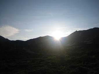 | 翌朝、早くに起きて、空が白み山頂から太陽が顔を出す様を、飽きもせず眺めていた。 空は真っ青に晴れて、朝の室堂は天国のようなすがすがしさだった。 次第に朝日に照らされていく山々が、何とも神々しい。 |
