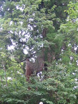 | 再び立山高原バスで、美女平へ。 美女平では散策の予定だったが、バスの係員に熊が出るかもと脅され、コースに踏み込むと如何にもそんな風だったので中止。 ケーブルカーの駅周辺にも、こんな立山杉を発見。少しわかり辛いが、幹の間に空洞が開いている。 |