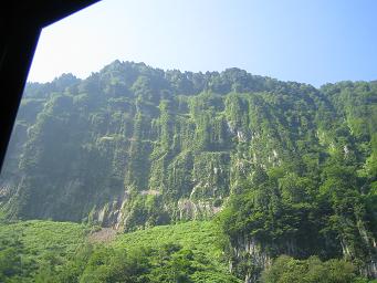 | 立山駅近くで一泊し、翌日は称名滝へ。途中バスの窓から、悪城の壁と呼ばれる断崖が見える。高さ約500m。 | |