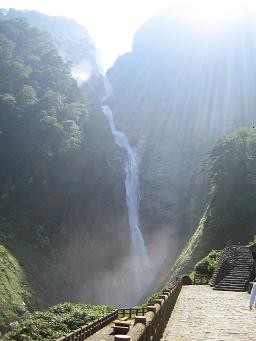 | これが落差350mの称名滝。午前中は逆光になって、きれいな写真は撮れなかったが、滝の手前の橋では、しぶきが風に運ばれて、きっと大量のマイナスイオンを吸い込んだはずだ。 | |