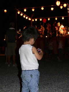 | ぴよ太、初盆踊り。 この後打ち上げ花火があがって、その音がとーてーも怖かったらしい。 |