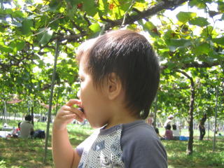 | 近くの観光農園でぶどう狩り。 ぶどうがたくさん成っているのを見つけておおはしゃぎ。 でもたくさんは食べられない・・・ |
