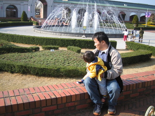 何を思ったか、パパ、突然髪を染めたいと言いだし、冗談かと思ってしばらく放っていたんだけど、今日とうとうヘアカラーを買ってきて、染めてしまいました。ヘアダイがあっちこっちに飛び散って大変でした。 仕上がりは・・・。 ま、初めてなので、おとなしめに。 ところで今日は、天気も良いのでフルーツフラワーパークに行って来ました。 噴水が止まったり、また不意に噴き出したりするのにびびるぴよ太。 成長したねぇ。 前に来た時は、噴水なんかまったく眼中になかったのに。 今回は、もう噴水が見える所にいる時は、ずーっとずーっと噴水を見ていました。 おもしろいんだろうなぁ。 大人でも噴水はおもしろいもんね。 |