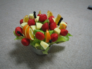 義姉の所でクリスマスパーティに呼ばれたので、作ってみました。フルーツブーケ。 日本ではあんまり聞いた事なかったけど、アメリカの学校で、ベビーシャワーを兼ねたポットラックをした時、誰かがすんごく大きいのを作ってきていました。 「わーすごい」と思うと同時に、どんな風に出来ているかを見て「割と簡単に出来るんだ・・・」と。 それで、いつかパーティとかで作りたかったのよね。 華やかに見えるし。 ところがいざ作ろうとして、問題が一つ。 日本は果物が高い! 特に、本場モノはイチゴ、メロン、ぶどうがメインで出来ているんだけど、スーパーで買おうとしたら、思わず手が引っ込む値段。 しょーがないので、イチゴははずせないとして、キウイとオレンジとリンゴでごまかしました(笑) 出来映えはいかに? |