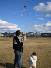 お正月休みで、実家の方に帰ってきました。お正月に同窓会があるので、服を買ってもらっちゃったり。3年分ぐらい買いました。気合入ってます(笑) コンタクトも買ったし、ブーツも買ったし。さぁ〜来ーい ところで、パパの気合が入っているのは凧揚げ。 アメリカで買った「海賊船」の形をした凧なんだけど、面白いと思って買ったものの「ほんとに上がるのかな〜?」と心配していました。 それを、正月だし、そろそろぴよ太も楽しめるかな?と、この正月にあげようと持って帰ってきました。 昨日は風が弱くて、まったくあがらず。 で、今日。 競馬場の中の広場で、ぴよ太も吹き飛ばされそうな強い風が吹く中であげてみたら、大成功〜〜〜 でも、風が強すぎて、今度は下ろすのが大変でした。 パパ、大苦戦。 それにしても、こんな妙な形の凧があがるものね・・・ 来年は、もう一つの「回転する凧(吹流し?)」を試してみなくちゃね☆ |