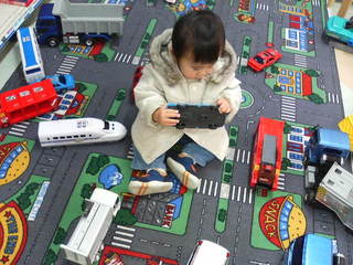 ぴよ太は、物を「回す」のが大好き。アメリカで買ってきた風車なんかも、部屋に置いておいたら、ず〜っと回しているし。 この間も引っ越し荷物の中から手回しろくろが出てきたら、驚喜してぐるぐる回し始めるし。 しかし何より大好きなのは、ミニカーのタイヤ! ミニカーを走らせるのも好きだけど、放っておくとずーっとずーっと車のタイヤをはじいて回している。 最近では噛んだりした事もあって、ゴムのタイヤに亀裂が入り、はずれかけて、くるくるスムーズに回らなくなってきた。 ちょっと回り方が悪いと、文句を言うぴよ太に、とうとう新しい車を買おうという事になった。 早速サティの3階のおもちゃコーナーへ物色しにいったけど、どうも今イチ。 消防車とかダンプカーじゃなくてもいいから、とにかくほどよい大きさで、タイヤがスムーズに回るヤツ。 ・・・と思ったら、ないのね〜。 立派すぎるか、タイヤが回らない(モーターとかついていて)かのどっちか。 ぴよ太も懸命にタイヤをチェックしていたけど(笑) しょうがない。 ぴよ太お気に入りのグレーのスカイラインも、もともとは食玩。 ならば、お菓子売り場にこそgoodなものがあるかもしれない。 というので、お菓子売り場に行ったら。 ありました、ありました。 「はたらくくるまシリーズ」300円。 ちょうどいい大きさ。タイヤもくるくる回りそう。 パトカーを1台買って、ぴよ太に渡したら、早速タイヤをクルクル回して、超ごきげんでした。 これからは、食玩の車も要チェックだな・・・ |