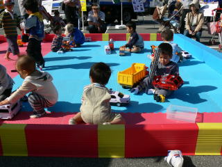 駐車場で「はたらくくるま」の本物が大集合!というイベントがあり、ぴよ太も喜ぶであろうと。 実物の運転席に乗せてもらったり、ハンドルを回したりと、まあ喜ぶには喜んだんだけど、何しろ同じような車好きの子供たちがいっぱい順番待ちで並んでいるので、せいぜい写真を撮って、2・3回ハンドルくるくる回したら、「はい交代、交代。順番、順番。」という感じでした。 2、3台回ったらはや欲求不満で大泣きのぴよ太。 そのぴよ太が突進したのが、ここ。 まだ本物の車にはちょっと早い子供たちのための、おもちゃスペース。 すごいね。 2歳前ぐらいから3歳ぐらいまでの、同じような年頃の、しかも男の子ばっかりがうじゃうじゃおりました(笑)。 そして取り合う取り合う。 もちろん、表だってけんかするほどの年ではないので、静かな取り合いです。 ふっと目をそらした隙に、今まで遊んでいた車を誰かが持っていく。そしたら、次誰かが目を離している車をさっと取る。 2人が同時に車をつかんだら、無言のにらみ合い。 目をそらしたら負け。 いや〜。動物の基本を見てしまいました・・・ ここより激しかったのが、遊園地の中の「プラレール館」。 足の踏み場もないほどの子供たち&その親&床に広がるプラレール。 もう少し年長の男の子たちが夢中になって遊んでいたのだけど、ぴよ太が余っていそうな車や電車に手を出そうとするたび、あわてて取り返しておりました・・・・。 3つ持ってたら、1つぐらい貸してくれたっていいじゃん、と思ったけど。 ま、しょーがない。 これぐらいの年齢の間は少々もまれるのも経験でしょう。 「木のおもちゃ館」では、幼児が大勢風通しの悪い部屋にいたので、ほのかにおしっことうんちの臭いが漂っておりました・・・。 おもわずぴよ太のおしりを確認しましたよ(-_-;) あ、そうそう。 イベントの一つで、「おもちゃ王国のお祭り」みたいなのがありました。 法被を借りて、ちいさな子供御輿をわっしょいわっしょいと。 ぴよ太も、パパの努力ではっぴを手に入れて、「おお!男前!」てな感じに仕上がっておりました。 が、おみこしの脇について歩いていたら、ハンディ・カムを片手にしたおばちゃん(怒。私より若かったけどむかつくので。)に突き飛ばされて、大泣き。 そのおばちゃん、「痛い〜!」と泣くぴよ太を、「あれ?当たっちゃった。てへ。」みたいな顔でちらっと振り向いただけで、おそらくその御神輿を引っ張っているのであろう我が子を、ビデオカメラに納めるべく走っていきました。 ちょっと〜〜〜。 普通、ぶつけてふっとばした2歳の子供が「痛い〜!」と泣いたら、たとえ体裁だけでも「ごめんね、大丈夫?」とか言うもんでしょう。 それを、「てへ?」みたいな顔だけで逃げるってどういうこと?え?どういうことよ。 やれやれ。まったく。 どんなに親バカでも、バカ親にはなりたくないものです・・・。 ま、そんなこんなのぴよ太ウィーク。 パパ肝いりの特注バースデーケーキ、ぴよ太の口には合わなかったらしく、3口で拒否されて、パパはしょげておりましたが。 このままぴよ太が元気ですくすく育ちますように〜☆ |