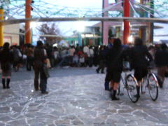 | 夕方、サティに買い物に行こうとしたら、やたら辺りを小中学生・高校生がうろうろしていました。 特に気にもせずにサティに着いたら、建物を取り囲むかと思うほどの自転車が並んでいました。 ![]() 何だ? ふと見ると、中庭に黒山の人だかり。 何だ何だ。 そこで思い出したのが、数日前の広告ちらし。 確か、吉本のお笑い芸人が、ライブに来るとか書いてあったっけ。 それか。 やってきたのは「笑い飯」と「藤崎マーケット」。 全国ネットではほとんど名前を聞かない芸人だけど、とりあえず知ってる。 私が知ってるぐらいだから、少なくとも関西ローカルでは売れてるんだろうなぁ・・・・。 買い物を終えて出てくると、もうライブは始まっていました。 でも・・・見えない。 背伸びしても見えないし。 遠くの方から、なんとなくあの辺が頭だなぁ、というのが見えたけど、それだけ。 何かマイクでネタをやっているみたいだったけど、観客がわさわさ話しているので、ほとんど聞き取れず。 うーん。 もうちょっとマシな舞台は作れなかったのかなぁ。 少しぐらいは見たかったな・・・・少しだけね(笑) |