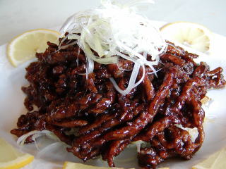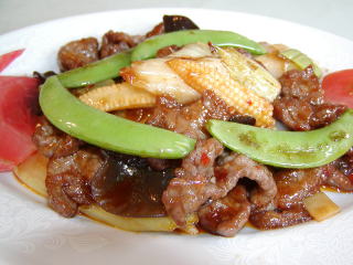 金醤牛肉 (チン・ジャン・ニュー・ルー) 牛肉の醤油味噌の炒め物 不辣菜(辛くない料理) |