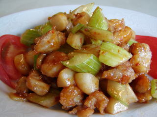 芹黄鶏丁 (チン・ファン・チー・ティン) セロリ・鶏肉のピリ辛炒め ★ 芹黄→セロリ 鶏丁→鶏肉の丁切り(さいの目切り) 辣菜(辛い料理) |