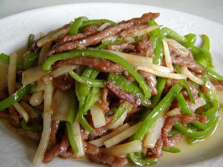 青椒牛肉 (チン・ジョウ・ニュー・ルー) ピーマン・牛肉の炒め物 ★ 青椒→ピーマン 不辣菜(辛くない料理) |