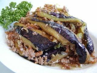 干扁茄子 (ガン・ピェン・チエ・ズ) 茄子と豚ミンシのカラカラ炒め ★ 干扁→からからに(焦げるに近い) 茄子→ナス あっさりした味です 不辣菜(辛くない料理) |
