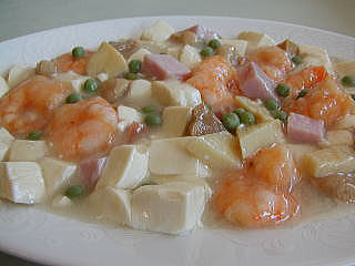 蝦仁豆腐 (シャー・レン・トウ・フ) エビと豆腐の塩味煮込み料理 ★ 蝦仁→エビ エビのプリプリ感と豆腐のふわふわ感 あっさり塩味 不辣菜(辛くない料理) |