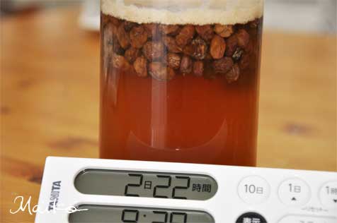 上の写真は前回起こした酵母液を入れて作る「種継ぎ」の様子 ですので、レーズンに対する水の量が多め(レーズン1に対し水6)になっています また、前回の残りの酵母液を加えたのですでに液が濁っています この場合のグラニュー糖ですが、水150gにつき小さじ1を目安に加えています このように長時間かかる作業には100日まで計れる長期間タイマー 作業にかかっている時間が一目でわかるので便利 |