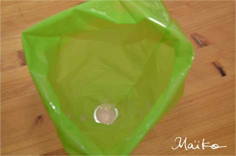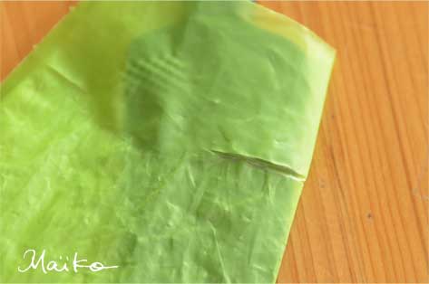 | 100均で購入のミニサイズ絞り袋 堂々と「ポリフィルム」との記載が・・・! 実際質感はポリ袋 ただ、市販のポリ袋にくらべ 三角の絞り袋使用になっているだけなんですが 使い勝手は激良です |