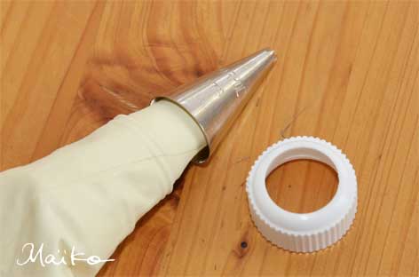 クリームを詰める際には 詰めたクリームが漏れ出さないように 絞り袋を詰めることがありますが これがまた 絞り袋を傷める結果に・・・ |