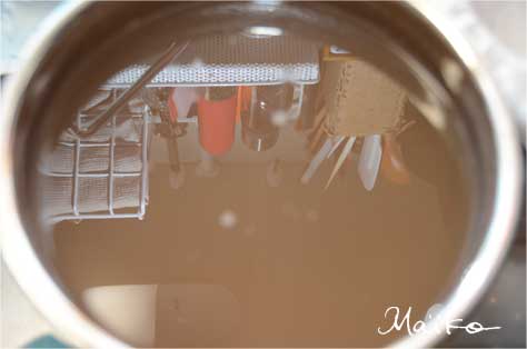絹フルイと27cmボール 粉をふるうときのように、 フルイを水の中で揺らして餡を漉していきます スパチュラは絹目につまったカスを退けるために使っており 絹目にグリグリ押しつけて 餡を漉しているわけではありません フルイをボウルの中で揺らすには フルイに対しふた周りは大きなボウルが必要になります |