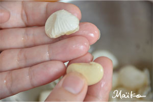 | 一般に白餡は大手亡豆や大福豆などの白えんどう豆で作りますが、今回は白花豆で作ってみました。 白花豆で作る白こし餡の最大の特徴は、皮を剥いて実だけを煮ることができること。 白こし餡については、本来どの豆で作る時も皮を剥いて煮るのが理想なんだそうですが、小さい豆だとそれは非常に手間の掛かる作業になります。 その点、大きな花豆だとラクラク。 皮を除くことで、エグミや臭みが押さえられ、餡の色も明るく仕上がるのだそう。 皮を剥く手間は掛かりますが、実だけなので煮上がりの判断がつき易く、越す作業が楽なのも◎。 味的には大手亡に比べてすごく違うということもない気がしますが・・・ 皮のエグミが付かないので、個人的には白花豆で作るこし餡が一番好きです。 |