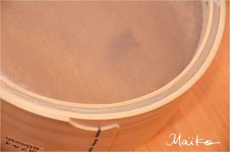 | 上の写真、左が粉ふるい程度の 目の細かい出汁取りザルで この商品が近い感じ 左がみそこし程度の粗めのザル 両方とも生協で購入したこちらの会社の商品 出汁取りザルは ネットで扱っているお店は 見つかりませんでしたが 非常に重宝する道具です 下は60メッシュの絹フルイ 今のところ こし餡作りでしか活躍の場はないですが あると餡の仕上がりが全然違います!! |