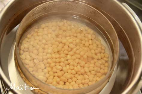 | 砂糖 | 210g | 好みに応じ白花豆の60%(150g)から170%(375g)程度の間で加減する | |