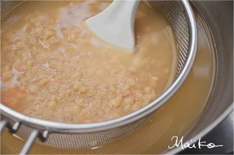 粉ふるい程度の目の細かい出汁取りザル こちらはおそらく30メッシュくらい 大きめのカスを取り除くのに使用しました カスは取り除けましたが まだ、餡子のモト以外の 大きめの粒子が残っています |