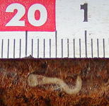 8月30日に家の廃材でベイマツをノコで切り、切りかすを作り、海苔のビンの中に、切りかすと新鮮な松の枝と葉と産卵をしていた枝を入れました。その後、幼虫2〜3匹が、切りかすの中を動き回っています。うまくいくと蛹になる様子が観察できるかも??。9月25日現在で、メス2匹は、少し動きは鈍いが、元気に生きています。 |
