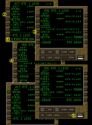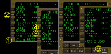 @CAVIAからMANATまでの方位は180°、距離は22NM(ノーティカル・マイル)である事がチャートによりわかったので、スクラッチパッドに『CAVIA180/22』とキー入力する(方位の入力は3桁で!)。 AMANATはSPENSの次に通過するwptなのでLSK2Lをプッシュしてスクラッチパッドに入力したデータをLSK2Lへ転送する。ページタイトルが『ACT』から『MOD』に変わり、LSK2LにCAVIA01と表示される。これが第@項で入力した『CAVIA180/22』に付けられた自作wpt名である。01というのはFMCが勝手に名づけたもので、自作wptが複数になるとRTE1の場合は01から始まり49までFMCにより名前が順番に付けられていく。 BLSK3LとLSK4Lの間にディスコンが挿入されている。このままではCAVIA01とCAVIAの区間はLNAVで飛行する事は出来ない(ディスコンのエリアに入ると、LNAVは継続してエンゲージしたままであるがHDG HOLDとして機能する。いわゆる隠れHGD HOLDモードである)ので、LSK4LのCAVIAをLSK3Lへ転送する事でディスコンを消去する。やり方としてはまずLSK4Lをプッシュしてスクラッチパッドにデータをダウンセレクトする。 C次にLSK3Lをプッシュする。スクラッチパッドに一旦下ろしたデータがLSK3Lに転送される(左から3番目のCDU画面参照)。 DEXECキーが点灯してデータの確定を促しているので、CDU画面とND画面をチェックして実行(エクスキュート)する。EXECUTEするとCDUのページタイトルが『MOD』から『ACT』に変わりデータが確定する。 |
