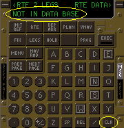 IN DATA BASE』メッセージが表示された。これはMANATがFMCのNAVデータベース内に収録されていないからである。そこで自作wptの登場だ。 C自作wptを作成する前に、取りあえずスクラッチパッドに表示されたFMCメッセージをクリアーしてしまおう。メッセージを消去しないとCDUへの入力が行なえないので……。 CLR(クリアー)キーをプッシュしFMCメッセージを消去。MANATの文字がスクラッチパッド上に残るのでそれもCLRキーにより消去する。 |