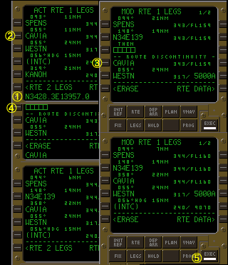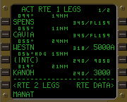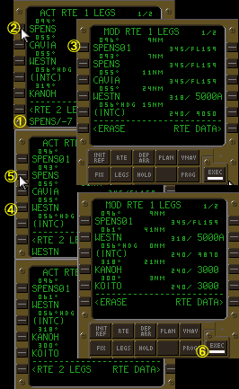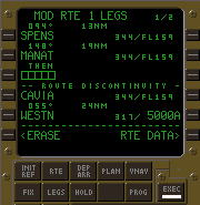 @SPENSの手前7マイルの地点に自作wptを作るのでスクラッチパッドに『SPENS/-7』とキー入力する。自作wptの作成は『基点FIX名/基点FIXからの距離』であり、基点FIXよりも手前に自作wptを作成する時は距離入力欄に−を入力する。基点FIXよりも先に自作wptを作成する時は+/−を入力する必要はない(−を入力していない時はプラスであるものとFMCは思慮するので)。 A基点FIXのLSKをプッシュする。この場合はSPENSが基点FIXである為LSK1Lをプッシュする。こうする事により自動的に自作wptがアクティブ・ルート上の正しい位置に挿入される(距離欄に−を入力している時は基点FIXの一つ上のLSKに、−を入力していない時は基点FIXの一つ下のLSKに自動的に自作wptが挿入される)。 Bさて、LSK1LをプッシュするとLSK1LにSPENS01と表示される、これが自作wptの名称である。LSK1Lに元々表示されていたSPENSはLSK2Lに表示されている。距離欄に−を入力した事によりFMCは『基点FIXよりも手前に自作wptを作る』ものと認識し、基点FIXの手前に自作wptを挿入した訳である。ALONG ROUTE WPTによる自作wpt作成の際にはディスコンは挿入されない。CDU及びNDをチェックしたのち点灯しているEXECキーをプッシュしてデータを確定するのであるが、その前に今回はルートのショートカット作業も行なわなければいけない。 CLSK4LをプッシュしてWESTNをスクラッチパッドにダウンセレクトする。 DLSK2LをプッシュしてスクラッチパッドのデータをLSK2Lに転送する。これでSPENSとCAVIAがアクティブ・ルートから消去され、SPENS01を通過した同機はWESTNへ直行するようになる。 Eまだページタイトルは『MOD』のままでEXECキーが点灯し、データの確定を促している。CDU及びNDをチェックしたのち点灯しているEXECキーをプッシュしてデータを確定する。 |