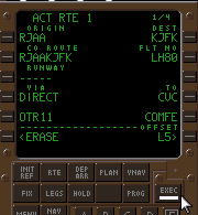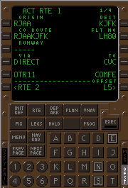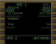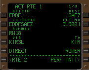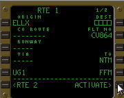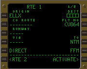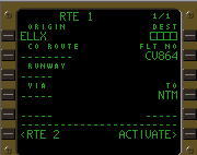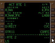 | デフォルトのRTEページ. 飛行前に所定のデータ を入力し、LSK6Rの ACTIVATEプロンプトを プッシュ、さらにEXEC キーをプッシュする事に より飛行ルートを確定する. |