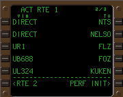 COPY(ルートコピー)プロンプトをプッシュする事で、RTE1ページに表示されていた直行コースを作成する前のデフォルトコースをRTE2ページにメモリーさせる事も出来る。これは管制から「もう一度先ほどのルートへ戻れ」という指示が来た場合スムーズに元のコースへ戻れるようにしたものである。最もそんな変な指示を管制が出すとは考えられないが……。