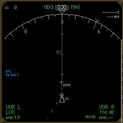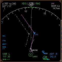 CDU右下にOFFSETライトが点灯 し、オフセットがアクティブになっ た事を示す.LNAVのままオフセッ トルートへ向けて旋回し、オフセッ トルートをトラッキングする. |