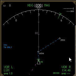 このVIAラインへは、マニュアリーでLNAVルートを作成する際にエアウェイの名称をマニュアル入力する事が出来る。例えば現在ルクセンブルクのアブダヒ空港(ELLX)にいるとしよう。離陸してNTMを通過後は、FFMへ向けてUG1というエアウェイを使用する事にした。この時のRTEページへのマニュアル入力の仕方をご紹介しよう。まず、LSK1LにELLXを入力、LSK2LおよびLSK3LはブランクのままにしてLSK4RのTOラインにNTMを入力する。すると現在位置からNTMまでのダイレクトコースが作成される。それはNDをMAPモードにする事で確認出来る。次にLSK5RにFFMを入力する。するとNTMからFFMまでのダイレクトコースが作成される。LSK5LにはDIRECTと表示されている。現状ではNTMからFFMまでの直線コースが作成されただけであるが、ここで一工夫する事によってNTMからFFMまでエアウェイに沿って飛行する事が可能になる。LSK5LにUG1を入力しよう。するとND画面内のNTMとFFMの間にUG1というエアウェイルートが表示され、途中に通過するwptが併せて表示されるようになる。途中で通過するwptはADENUとRUDUSである。これはCDUのLEGSページにおいても確認する事が出来る。